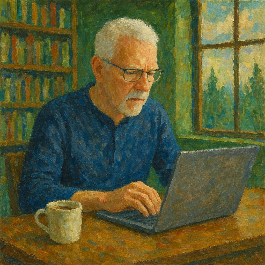Vielleicht haben Sie zuerst das Bild über diesem Text betrachtet: ein Mann mit weißem Haar und Brille, vertieft in die Arbeit am Laptop, eine Tasse Kaffee griffbereit, Bücher im Rücken, draußen hinter dem Fenster Grün und Licht. So verbringe ich viele meiner Tage – mitten in Geschichten.
